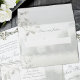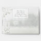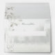 A soft and celebratory Chuppah wedding invitation envelope to match the invitation featuring a foggy forest woodland background with white birch trees, anemones, peonies and roses with silver dollar eucalyptus greenery, all in a soft white tone-on-tone opaque background.