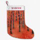 A modern landscape painting of a birch or aspen tree forest in the autumn in rich tones of red, orange and yellow.