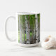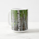 Closeup of a group of birch trees showing details of their beautiful white bark and light green leaves at the top