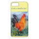Rooster Chicken iPhone case with a Cockerel strutting across the grass and customisable text. This colourful bird art is from my original rooster glass painting. Copyright Annabel Potter