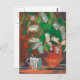 Postcard featuring pastel painting in impressionist style, spring still life - blooming bird-tree branches with bright white flowers and fresh green leaves in clay jar and coffee mug on striped tablecloth.