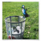 A cartoon, generic blue harlequin-coloured bird hybrid with features of a blue jay, raven, heron, and hawk, with a blue/black crest on a trash can. The trash can is the photo itself. :)