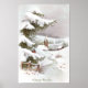 A bird sits in a snow-covered pine tree next to a path leading to a church and town in a valley in this vintage New Year's postcard from 1912.