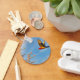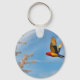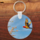 A serene background with a vibrant bird in mid-flight, its plumage an enchanting mix of bright yellow, fiery red and cobalt blue feathers, soaring through a gorgeous clear blue sky. On the left side of the background, a delicate green branch extends outward, decorated with clusters of soft pink leaves catching the gentle breeze.