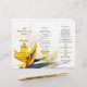 Bird of paradise wedding program to fold into thirds. Pretty, exotic yellow flowers decorate paper with three sections of text templates. The paper will be folded (by the customer) accordion style with a front, middle and last page. Text is black with a title, names, location and date on the front. The middle section is for the ceremony order and the last page is for listing the officiant, parents, and wedding party.