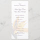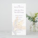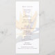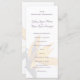 Bird-of-paradise flat wedding program template. Tall, flat programs are 4x9 inches with white paper offering optional upgrades. Text is dark purple with the order of the ceremony on the front and more text on the back to list wedding party members and thank special people. Names are in modern calligraphy printing and the remainder of the wording is uppercase print. An exotic yellow bird-of-paradise flower is the background for text on both sides.