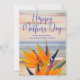 Orange bird of paradise flowers Mother's Day flat greeting card. Ocean scene background with sunset sky colours and bright blue text. Large script at the top for "Happy Mother's Day" greeting, and printed text beneath for a short message (to the best mum ever) and signature. Brightly coloured exotic flowers, in orange and blue, decorate the bottom of the card. Buy printed or as an instant download.