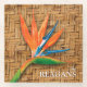 Personalised glass coasters feature your last name and an exotic tropical bird of paradise watercolor flower on a woven wicker background. MATCHING items in our store.