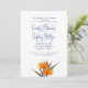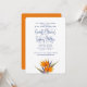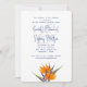 Bird of paradise wedding invitations with exotic, orange flowers design. Dark blue text using modern fonts printed on white, vertical paper. A large "and sign" holds the names. Customise to include a wedding website, reply online, or add reception info. This design also comes as an instant download.
