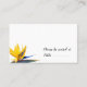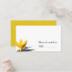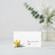 Bird-of-paradise table seating cards to use as escort or place cards. White cards with a tropical flower in bright yellow and blue in the lower corner and custom script text for the table number. Hand write names on each card to escort guests to their respective tables. Or delete the sample wording and use for names only (place cards). Reverse is golden yellow colour.