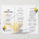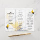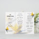 Bird-of-paradise wedding program template. Tri-fold, image and text on one side, is to be folded into thirds - in accordion style - after purchase. Tropical flowers are part of the background with smaller images along the sides. Perfect for a summer wedding, tropical themed celebration, and Hawaiian ceremony.
