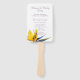 Rectangular fan program with a bird-of-paradise flower design. Choose white or ecru paper to customise with text on front and back. Fans will be glued together after purchase, or you may pay extra to have them pre-assembled. Text is dark purple with a single yellow tropical flower image on the front bottom.