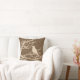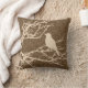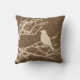 Throw pillow in a stylised silhouette of a little bird perched on a lacy tree branch, in light beige, against a chocolate brown and beige background in a vintage, Japanese swirl pattern