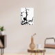 This contemporary fine art poster features a black and white modern abstract pattern of a silhouette Dark-eyed Junco (Junco hyemalis) perched on a bare branch high in a tree. This bird is actually a kind of small, grey and white sparrow.