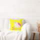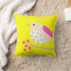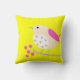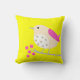 Bright colours on pillow. Cute pink and white bird is on a branch with blossoms against a bright yellow background.