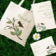 Bird birthday collection featuring a brown bird on a tree branch amidst leaves and bright blue flowers