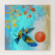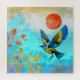 This gorgeous design depicts a blue and gold bird makng a landing on a golden tree with a beautiful sky of many blue colours and a bold orange sun.
