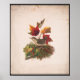 Print shows a small bird perched on a tree branch covered with moss and berries, with autumn foliage.