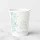 Personalise these wedding party paper cups with your own couple's names and wedding date. Cute birds by a cage with spring blossom in pretty green shades on white, other matching items are also available. © Original graphic two birds in an open birdcage drawing with graphic green hearts design by Sarah Trett for www.mylittledenweddings.com on Zazzle.