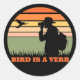 Bring a smile to any birdwatcher's face with our bird-themed sticker with a man watching a bird against retro sunset! Featuring a playful design that's sure to delight bird enthusiasts, this sticker is a must-have for anyone who loves feathered friends. Whether you're a seasoned birder or just enjoy a good bird pun, this sticker is perfect for adding a touch of humour to your belongings. Stick it on your water bottle, laptop, or journal and show off your love for all birds. This sticker is a fun and quirky way to express your passion for birds!