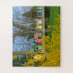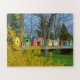This adorable jigsaw puzzle shows a row of colourful birdhouses basking in the spring sunshine. A yellow forsythia bush, trees, blue sky and green grass frame the row of unique birdhouses.