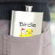 Birdie in curly text with a yellow chick holding a golf club and the flag in a golf hole is a funny gift design for golfers.