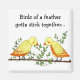 Two little birdies perched on a branch with vines, chirping to one another. A cute saying 'birds of a feather gotta stick together."
