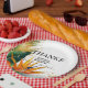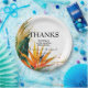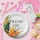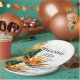 In the centre of the round paper plate, a heartfelt caption expresses gratitude: "Thanks for joining us on this special day of love and joy." Below the caption, couples' names are elegantly presented, accompanied by the wedding date and the location. This thoughtful and visually stunning design adds a unique and intimate touch to the paper plate, making it not only a functional element but also a charming accessory that beautifully echoes the love and vibrancy of the Birds of Paradise Bliss collection.