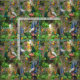 White and emerald green Peacocks, multi-colour Parrots and Pink Flamingos, among tropical exotic plants and rose, pink and white flowers