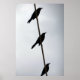 A set of three birds sit together on a wire silhouetted by cloudy skies overhead. Beautiful stark black and white photography by artist Rick Short of a simple shot of nature interacting with our environment. Copyright Rick Short, all rights reserved.