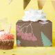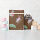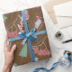 Brown Christmas wrapping paper featuring a charming design of fir trees, birds dressed in sweaters with earmuffs, green holly leaves, sprigs of holly berries and sleds full of Christmas presents to add a unique and whimsical touch to your Christmas gift wrapping this year.