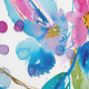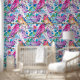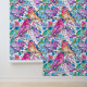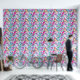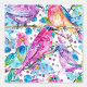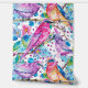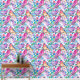 A seamless pattern in watercolor style featuring colourful birds sitting in a tree adorned with pink and blue blossoms, set against a white background. The design captures the beauty of nature with artistic flair, combining vibrant colours and delicate details.