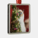 Captivating blue point Birman peeks around a Christmas tree to look for Santa.