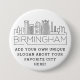 A customisable button representing the beautiful city of Birmingham, Alabama. This button features a stylised deco illustration of the city's unique skyline along with its name underneath. Underneath the city name is a spot for your unique slogan or statement about your favourite city.
