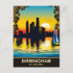 Sunset on Birmingham waterfront buildings, Alabama. Sailing boat on the water. Illustrated vintage travel poster.