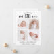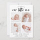 Simple and minimalistic birth announcement card featuring hand lettered typography that says "our little one" with 4 photo on the front.