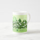 A bone china mug with hand-illustrated flower-of-the-month frieze and birthstone for May.