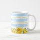 The Flower-of-the-Month and Birthstone for March on a striped mug. The flower and gem pair for March is the Daffodil and the Aquamarine.