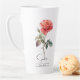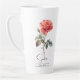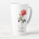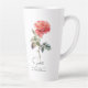 Birth month flower June Rose latte mug with an illustration of a rose flower. Below the flower, the name is written in an elegant script font. Beneath the name, it states "June - Rose," indicating that the owner's birth month is June and her birth flower is the rose. It is a personalised mug, created as a thoughtful gift for someone born in June.