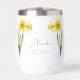 Birth month flower March Daffodil wine tumbler featuring an illustration of daffodil flowers. Beneath the flowers, the name "Alexandra" is written in a stylish script font. Below the name, it states "March - Daffodil," indicating that Alexandra's birth month is March and her birth flower is the daffodil. It is a personalised wine tumbler, likely customised as a special gift for someone born in March.
