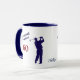 On this cute birthday mug, a navy blue silhouette golfer takes a full swing. The blue and red text next to the image says "Still DRIVING IT HARD at 60". Sure to be an office conversation starter for any man who loves to golf! The image is printed on both sides, with his name or other custom text between them.