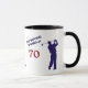 This cute birthday mug shows a navy blue silhouette golfer taking a full swing. The blue and red text next to the image says "Still DRIVING IT HARD at 70". Sure to be an office conversation starter for any man who loves to golf! The image is printed on both sides, with his name or other custom text between them.