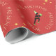 The text on this sport-themed wrapping paper can be edited for your preferred greeting, or simply use the supplied: "WILL RUN FOR BIRTHDAY PRESENTS". The design shows a silhouette pictogram runner wearing a party hat and boots, and carrying a gift-wrapped parcel. The background is red, and there are yellow stars for added decoration.