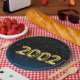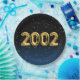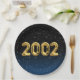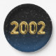 Gold foil balloons for 2002 birth year on gradient black and blue background with night stars for birthday party.