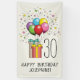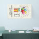 Birthday theme design featuring colourful birthday balloons and two present boxes wrapped with pretty bows. The design is framed by cheerful confetti made out of stars and dots. The colour scheme includes colours such as red, pink, blue, yellow, purple, teal, and beige. There are also two personalizable text areas where one is meant for the person's age and another is meant for custom text.
