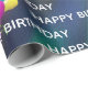 Colourful angled abstract blur pattern with Happy Birthday text and party balloons.
