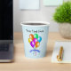 These paper cups are light blue with a bunch of bright colourful balloons in a multiple of colours with hanging matching streamers and a blue banner that says Happy Birthday. Customise your text with the templates on the front and back.