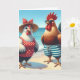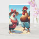 A rooster and a hen dressed in beach swimwear stand on a sandy shore with blue ocean waves in the background