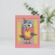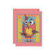 A colourful cartoon bird wearing a party hat stands in the centre of the card with the words "Happy Birthday" written vertically on both sides. The background features a pattern of wrapped presents in cheerful colours.