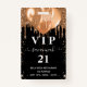 A modern, stylish and glamourous badge for a 21st (or any age) birthday party. A black background with dark faux gold glitter drips, paint dripping look and balloons. With the text: VIP. Personalise and add name, age, address/date. The name is written with a modern dark rose gold coloured hand lettered style script with swashes.